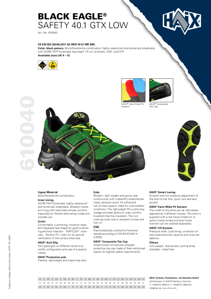 Die Sicherheitshalbschuhe „BLACK EAGLE Safety 40.1 low“ von HAIX® sind die perfekten Begleiter für fast alle Arbeiten im Außenbereich. Das Obermaterial der Schuhe ist aus Microfaser gefertigt, welche mit atmungsaktiven Textil-Einsätzen ausgestattet ist. Im Inneren sind die Arbeitsschuhe gleichzeitig mit dem wasserdichten GORE-TEX® Extended-Futter ausgestattet, welches Ihre Füße vor Nässe schützt und gleichzeitig hohe Atmungsaktivität bietet.