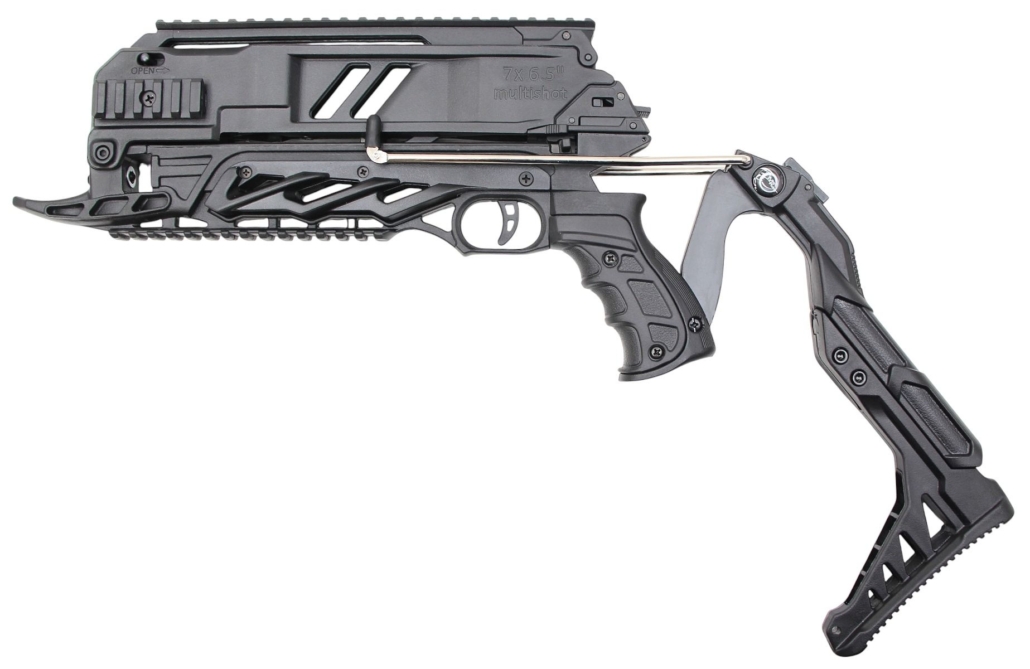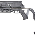 Bedingt durch den Knickspannmechanismus ist der Kraftaufwand beim Spannen reduziert. Eine längenverstellbare Schulterstütze sorgt für eine stabile Schussposition. Der Vordergriff ist abnehmbar und unterstützt die Handhabung. Vier Picatinny-Schienen (oben, unten und seitlich) ermöglichen die Montage von Zubehör wie z.B. Zieloptiken